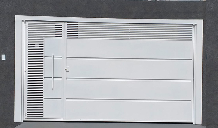 PORTÃO EM CHAPA TIPO VENEZIANA COM DETALHE EM TUBO 20X20 NA PARTE SUPERIOR