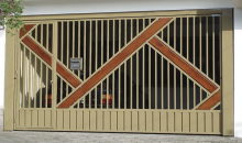 PORTÃO TUBULAR 30X20 ESPAÇAMENTO DE 70MM COM DESENHO EM MADEIRA E CHAPA LAMBRIL NA PARTE INFERIOR